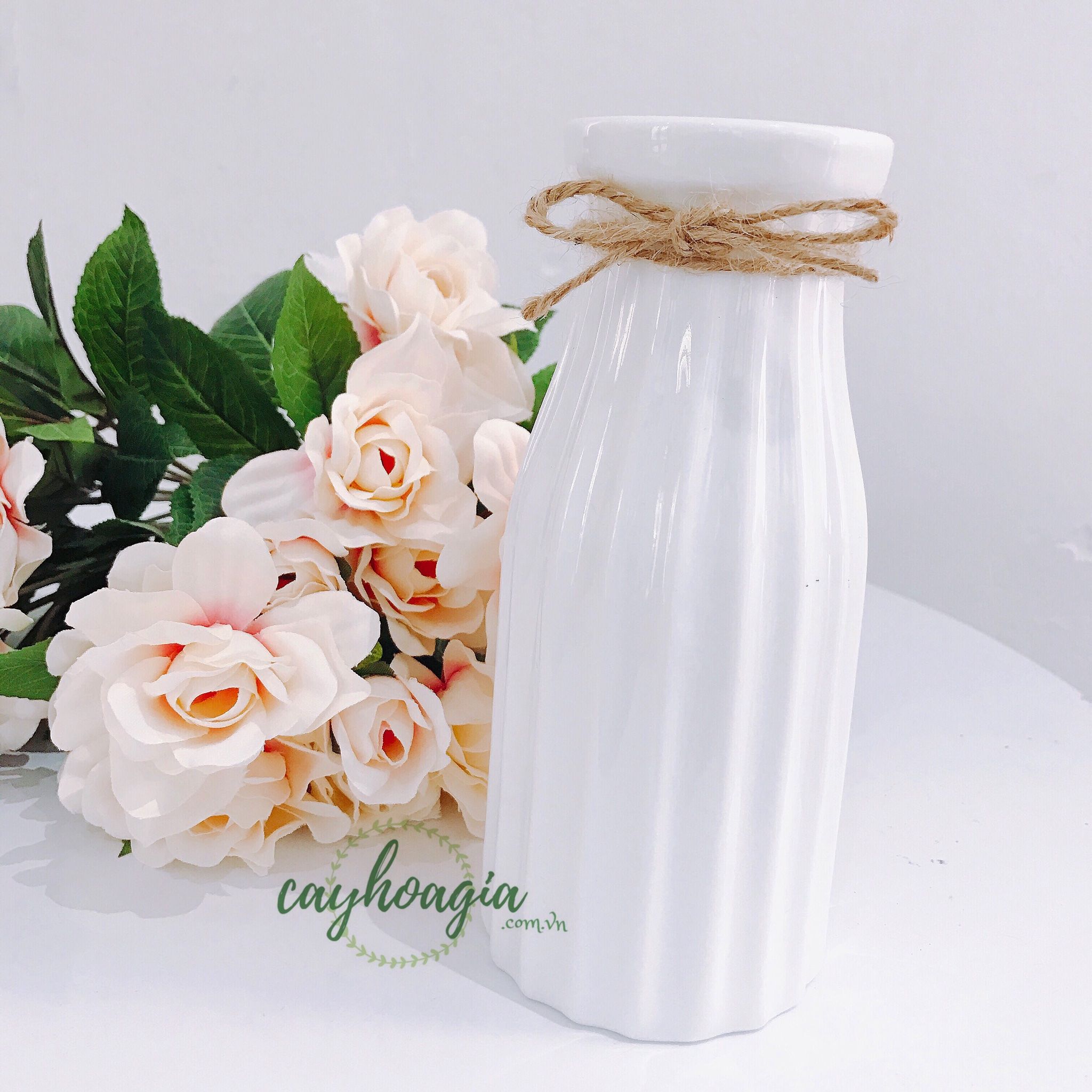 Lọ hoa được làm bằng đất có độ trắng cao, ít co ngót, chó ra thành phẩm bình bóng đẹp, đi kèm với lọ là dây gai buộc miệng bình để khách hàng trang trí thêm lọ hoa.