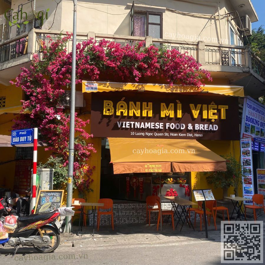 Chúng tôi, Cây Hoa Giả, đã hợp tác cùng anh để tạo nên một giàn hoa giấy rực rỡ sắc màu, vừa hài hòa với không gian cổ kính của quán, vừa mang lại sự tươi mới và gần gũi như thiên nhiên. Giàn hoa giấy không chỉ là một điểm trang trí đơn thuần, mà nó đã trở thành một phần của câu chuyện quán bánh mì này. Mỗi cánh hoa như kể lên một phần hương vị và bản sắc Việt Nam.