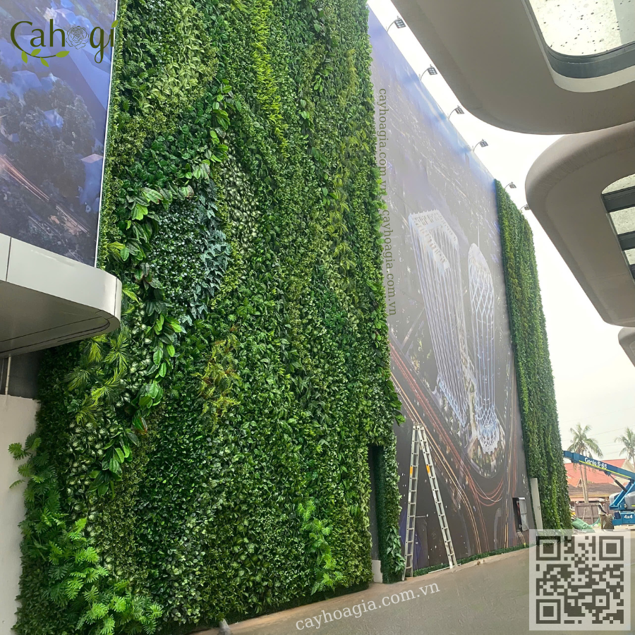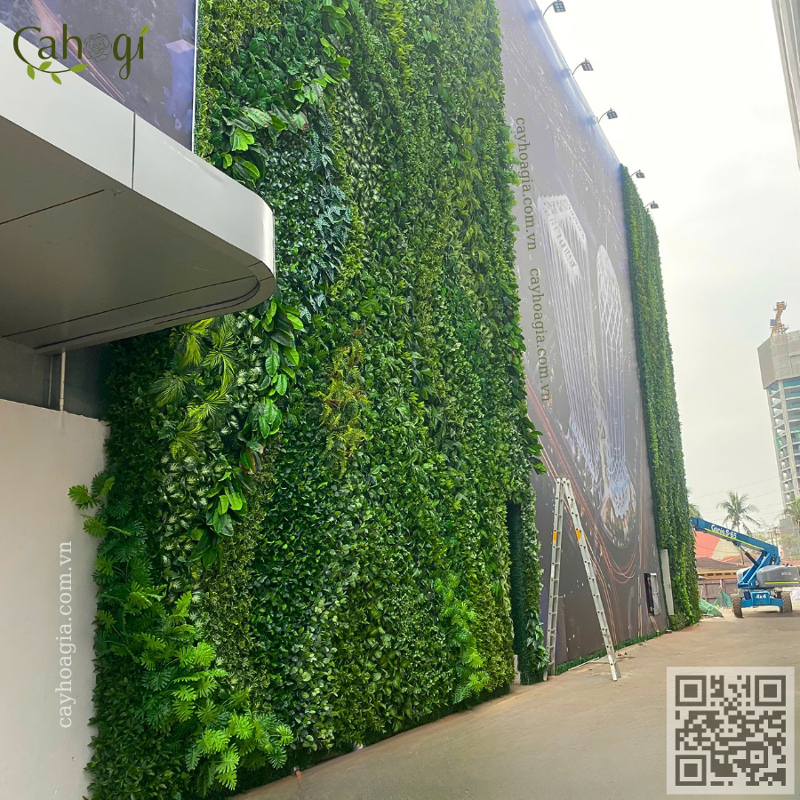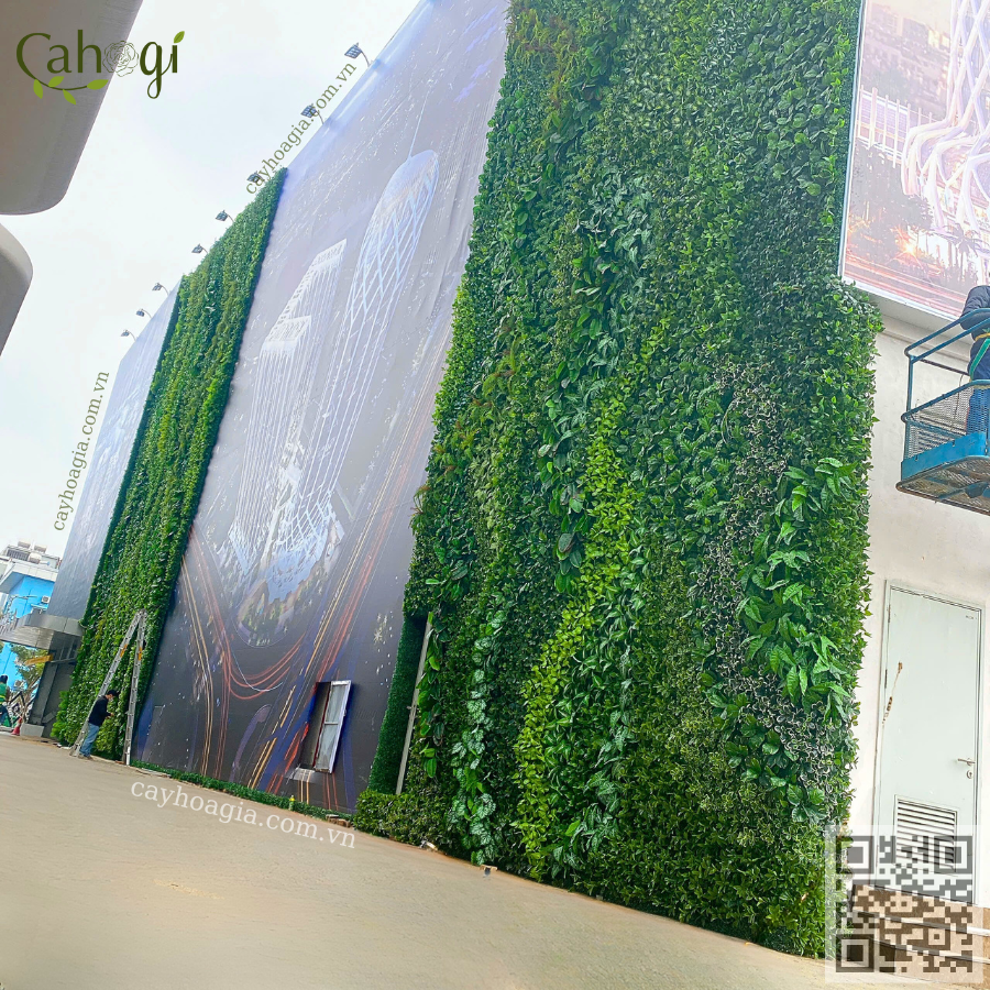 Để đạt được sự hài hòa giữa mảng xanh tự nhiên và hệ thống quảng cáo quy mô lớn, đội ngũ Cayhoagia.com.vn đã thiết kế tường cây giả với: